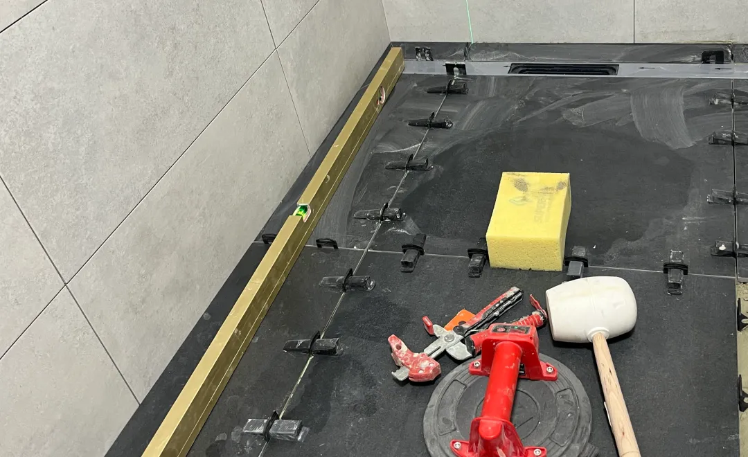 Wij plaatsen wanden waar nodig, egaliseren vloeren en wanden, brengen kimband aan en tegelen met uiterste precisie.